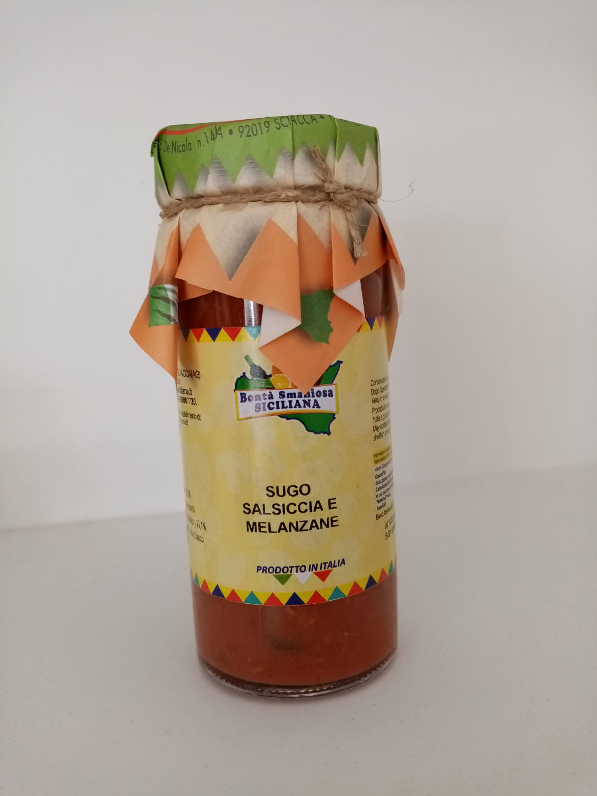 Prodotto artigianale senza far uso di conservanti, coloranti e/o additivi. Ingredienti: passata pomodoro 53%, polpa pomodoro 15%, melanzane 15%, tronchetti di pesce spada 15%, cipolle. olio extra vergine d'oliva, vino, sale, zucchero, aglio, basilico, aceto e pepe. Vaso con contenuto da gr.300 Prodotto e confezionato nello stabilimento di contrada castellazzo S.S.188 km.89 92017 Sambuca di Sicilia