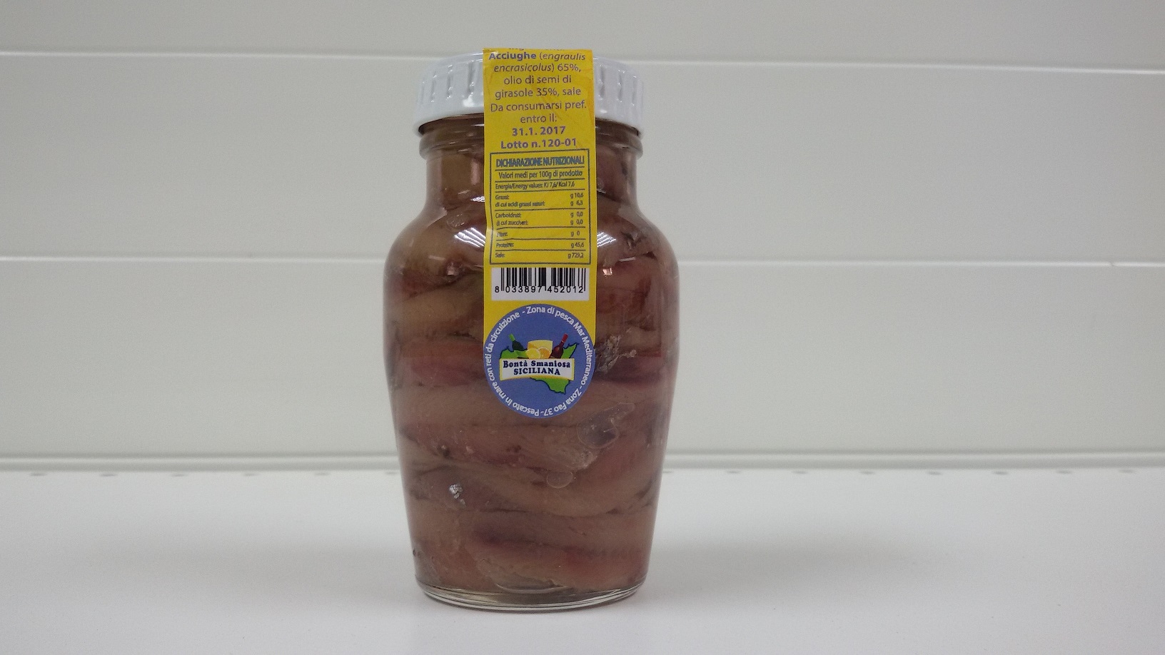 Prodotto pescato nel mar Mediterraneo viene lavorato entro 24 ore dalla cattura. Le acciughe selezionate, decapitate, eviscerate manualmente, sono pressate in salamoia per il tempo necessario alla maturazione. Successivamente vengono lavate, private delle parti non edibili (pinna, code) e sfilettate. Il prodotto viene conservato in olio di girasole in vasi di vetro. Il prodotto è ad alto contenuto di omega 3. Ingredienti: filetti acciughe, olio di girasole, sale.